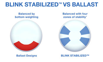 Unlike ballast designs that have a single zone of stability at the bottom of lenses, BLINK STABILIZED™ lens design uses four zones of stability to help keep lenses where they need to be.